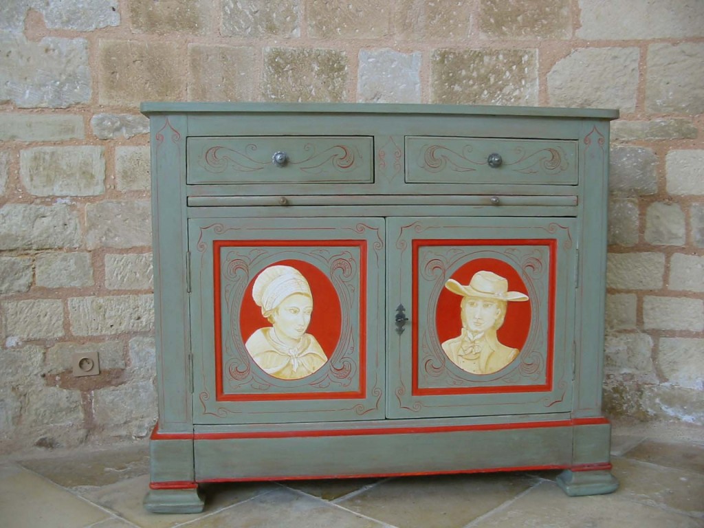 Pour décorer ce meuble j’ai utilisé des produits très anciens : la colle de peau colorée en rouge pour le fond, la colle de farine de seigle colorée en vert pour la couche de finition. Les personnages, qui apparaissent sur le même fond rouge dégagé en médaillon, sont peints à la caséine. La couche de farine de seigle a permis de graver des arabesques faisant ressortir le fond rouge, selon la technique utilisée pour décorer les pendules comtoises.